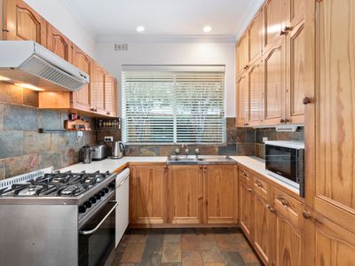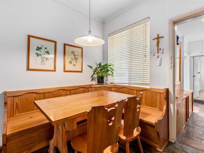 The retro-style eat-in kitchen is both functional and full of character, equipped with a freestanding stainless steel oven and cooktop, ample cupboard space, and a cozy built-in dinette. Accommodation includes four generous bedrooms, two bathrooms, and an internal laundry for everyday convenience.