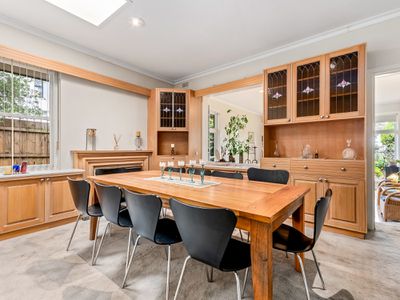 The inviting living room is filled with natural light and features beautiful parquet flooring, high ceilings, and a striking glass wall overlooking the private, established gardens. A separate dining room is perfect for family meals and entertaining, enhanced by custom display cabinetry that adds a touch of nostalgic charm.